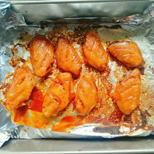 让腌制的翅膀放上,烤箱中层,上下火200°C,烤了15分钟时取出翻个面刷层酱料,再烤15分钟,就可以了。