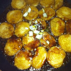 两面煎好后,倒入高汤,撒上葱花,滴一滴老抽(只要一滴足够),放少许盐,盖上盖子微焖片刻,汤汁收干装盘。