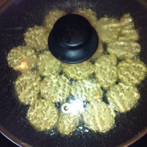 盖上锅盖煎片刻,等到一面金黄色,翻面继续煎。