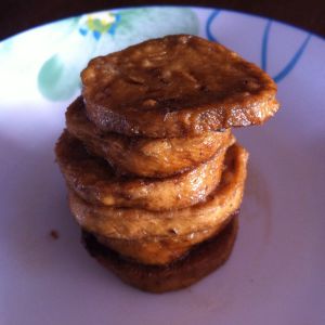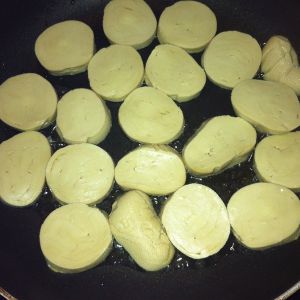 锅内放少许植物油,油热后放入素鸡片,小火慢煎。