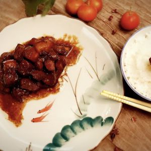 热锅将油烧热后,加入葱、姜煸炒出香味后,倒入五花肉,分别加入5g料酒、生抽、老抽、冰糖翻炒至肉上糖色