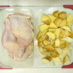 煮土豆的同时可以制作烤鸡腿的酱汁。半个柠檬挤出汁,加入两勺蜂蜜,两勺芥末酱,一勺橄榄油,盐适量,迷迭香碎适量。(也可以邀请同伴加入,一个煮土豆,一个配酱汁,边聊边干活,不脏不累也不会受油烟和油锅影响!)