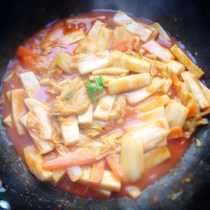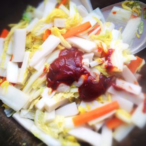 加入煮软的年糕一起翻炒同时加糖,炒匀后加入韩式辣酱搅拌