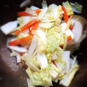 年糕软了即可捞起,锅入油先炒胡萝卜条和菜,翻炒加盐调味