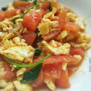 盛出鸡蛋,锅里倒油,油热倒入大蒜和西红柿翻炒出汁。中途加了一点水焖了大概两分钟吧。再放入煎好的鸡蛋,香菜,蒜叶,盐翻炒均匀出锅。