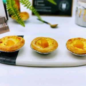 首先将黄桃罐头切小块,放入蛋挞皮中。