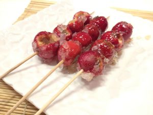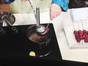 糖浆熬好后,迅速将山楂串放在锅边,用勺子将糖浆均匀淋上后,放入抹油的盘子里。