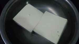 锅中烧水,水开倒入豆腐焯水,水开后捞出豆腐待用。