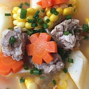 转小火,放入玉米,20分钟后放入番茄,20分钟后转中火,放入胡萝卜,10分钟后放入山药和盐,再15分钟后关火,出锅,撒点小葱。