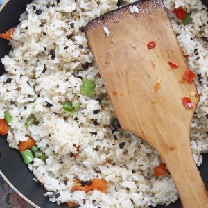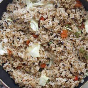 锅里补油,倒入豆豉、辣椒、蒜末炒香。入包菜叶,再倒入米饭翻炒均匀