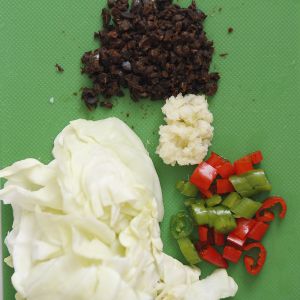 豆豉切碎,包菜叶撕成小片,红绿辣椒去籽切丁,蒜瓣拍碎切成泥