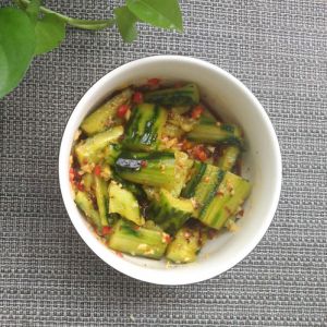 新鲜黄瓜是重点 如图备好 热油后将蒜辣椒下锅爆炒再淋在黄瓜上 再加入老干妈拌匀