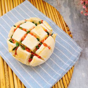 馒头缝里塞入马苏里拉奶酪碎,可以借助叉子。