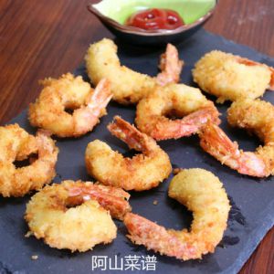 腌好的虾沾一层淀粉,一层鸡蛋液,一层面包糠