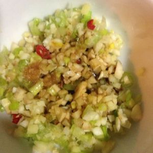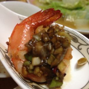 最后,将酱汁连同姜葱蒜末一直放在虾球上。完成