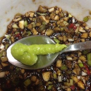 加入一点点的糖、一点点盐,酱油,陈醋,到味道都能充分表现出来,最后加入芥末,制成,集齐酸辣辛香的神马酱汁