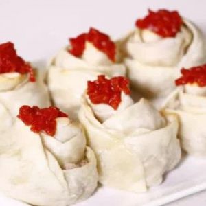 将饺子皮前后叠起来,从一端开始卷,把它卷起来。