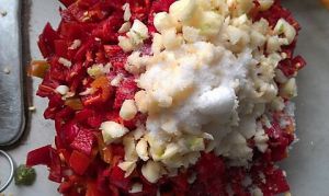找个无油无水的盆将,辣椒末跟蒜蓉一起放入,加少许糖提鲜,适量盐调味,最后倒入一点高度白酒,白酒不仅能让剁椒酱防腐保持不坏,还能增加辣椒酱的香味。将这些食材充分拌匀。