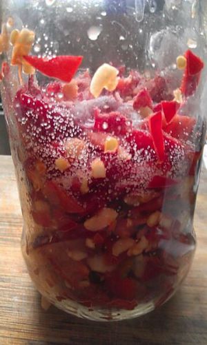 因为不是专业的密封罐,所以我在瓶口加了两层保鲜膜,然后再盖上盖子,这样就万无一失了。把剁椒酱放进冰箱发酵两个礼拜就可以吃了啊(其实放室内常温也可以的,那样发酵的会更快)白酒的酒味也会在发酵中淡化掉。喜欢蒜香味浓的朋友可以多加点,不喜欢的可以适量减少用量。我的这个瓶子有点大了,嘿嘿,凑合着吧。