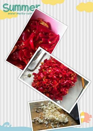 将辣椒去蒂,切成块,不用切的太小,大蒜切成蓉,待用。