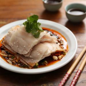 蒜茸中加入生抽、辣子红油、香油、盐和白糖搅拌均匀成调味汁。将调味汁淋入盘底,摆上肉片,撒适量葱花即可。