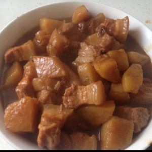 五花肉切好用水煮,撇去浮末。土豆切块备用。蒜拍碎,姜切片。