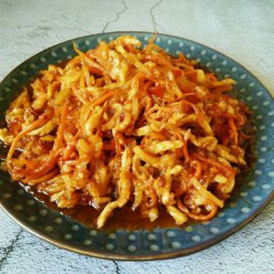 放入肉,把秘制汤料放进去,翻炒1分钟出锅。