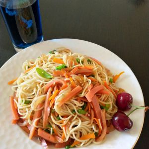 胡萝卜洋葱炒半熟加入火腿肠和青椒翻炒。