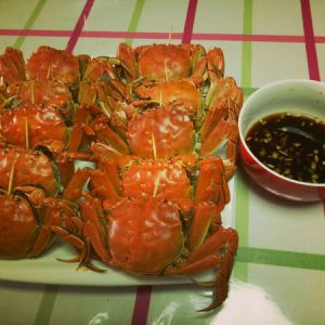 装盘,看看没有一只螃蟹掉腿。小碗倒醋,加姜粒,滴几滴味极鲜,蘸料成功了,大快朵颐吃起来吧