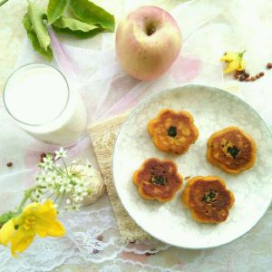 把包好馅儿的南瓜饼坯放进去,手掌用力一压。