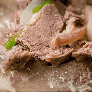 将羊肉烧皮、洗净、去骨;羊肉和羊骨用清水漂5个小时,期间每小时换一次水,并用手将羊肉柔一下,将血水挤出
