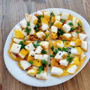 鸡蛋液打散后,淋在馒头粒上,盖上锅盖中火1分钟左右,关火