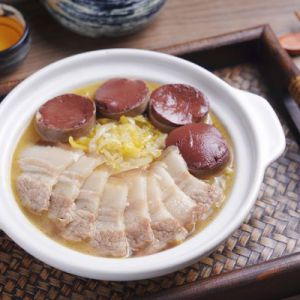 锅中加入适量水,放入猪骨、五花肉和葱姜。