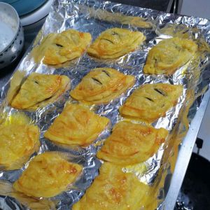 把蛋挞皮的锡纸弄掉,对半折起来捏紧收口,刷上蛋黄液,用刀划两下。可以撒点芝麻,我忘记买芝麻了所以没放。