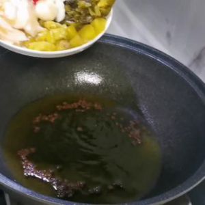 锅里热油,放入花椒,把酸菜、泡椒、小米辣、泡椒、泡姜、老姜、蒜一起放进油锅内炒香后,加入红酸汤继续炒岀香味;加入腌好的鱼骨鱼头翻炒均匀,加入开水没过鱼两指,煮开后放入葱段煮3分钟