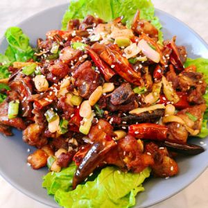 将锅洗净加热倒入少量食用油,把备好的干辣椒、花椒、生姜、大蒜等放入锅内慢慢爆香
