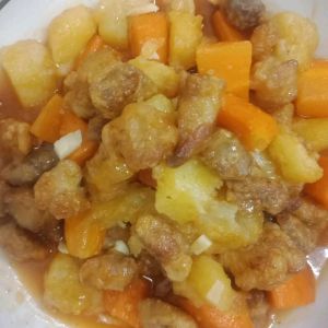 调糖醋汁,我这个是小白版本,准备一小勺生粉调成水淀粉,锅里开小火加半碗水、盐、番茄酱、蒜末、白糖、白醋,小火,搅拌均匀,水开后加水淀粉,倒入肉、胡萝卜、土豆,翻拌均匀就可以出锅了。