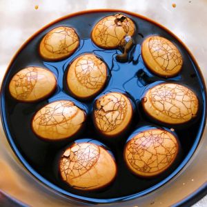 鸡蛋煮熟后过几遍凉水。用勺子将蛋壳轻轻敲碎