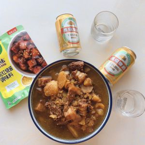 炒好的肉直接倒入压力锅,准备好家乐桂花红烧酱调味料