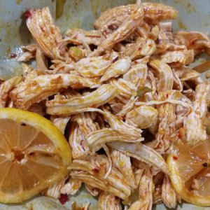 鸡肉撕成条,放几片柠檬,再挤点柠檬汁