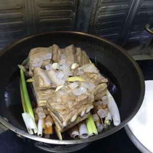 2、加水、葱、姜,少量料酒,开锅煮10分钟