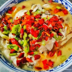少许油,青红辣椒、干辣椒、葱、花椒炒出香味,淋到鱼肉上。完成
