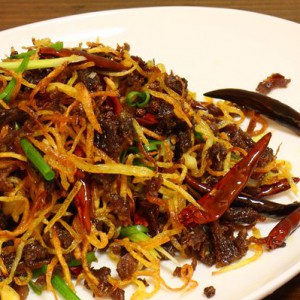 10. 所有材料炒匀后放入炸好的土豆丝用旺火翻炒均匀。