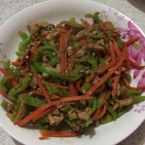 将里脊肉切丝,用料酒、酱油、胡椒粉、姜丝腌制。将胡萝卜、尖椒切成丝备用。