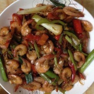 爆炒出香味放入炸好的虾,接着放入料酒,酱油,蚝油,盐少许(可根据自己口味调),继续爆炒片刻即可