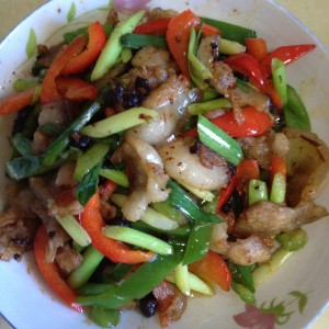 味道出来了再依次倒红椒(因为比青椒厚所以先下),青椒,蒜苗,翻炒均匀,自己看着肉别炒久了,不然老了,最后起锅的时候加白糖和盐巴,再炒均匀就ok了