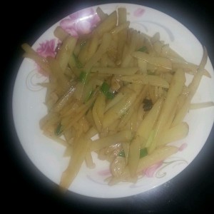 把辣椒对半切、大蒜切碎、锅里倒油、再都倒进去、而后把土豆丝也倒入、放盐、味精、鸡精、香醋、翻炒调味一下、最后再撒上一些葱就可以出锅了