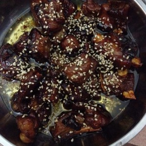 倒油翻炒,依次加入一勺白酒二勺醋三勺糖四勺酱油