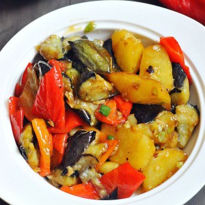 放入炸好的茄子,土豆,青椒,迅速翻炒
