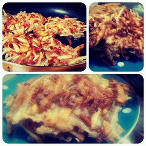用平底锅放入油,待油沸腾之后 把土豆分量放在锅里煎为双面黄,就可以出锅了